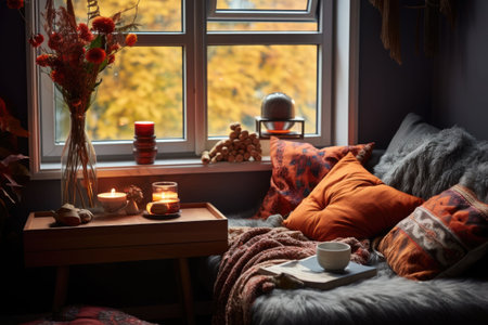 Cozy corner with plush cushions, blankets and autumn accents. AI generated illustration