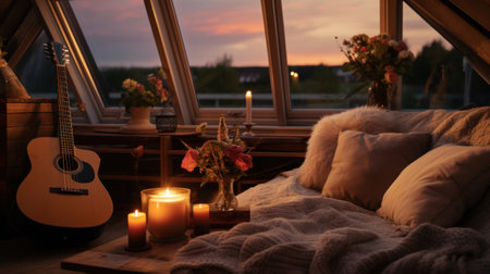 Warm evenings on the attic with a guitar and candles. In the style of hygge.