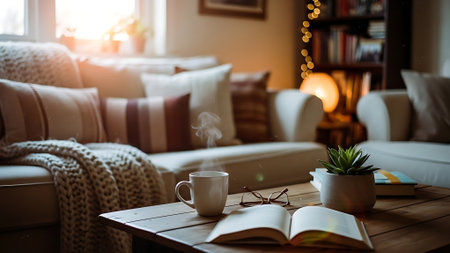 A serene living room scene featuring a beige couch with a knitted blanket, a wooden side table with a stack of books, a steaming white coffee cup, and a potted plant, bathed in warm sunlight.