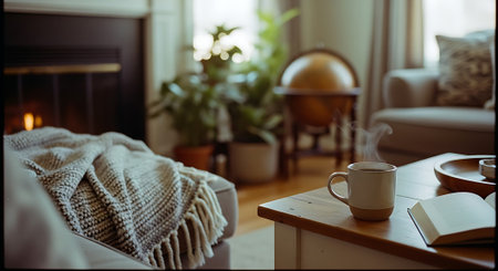 A cozy living room scene featuring soft cushions, a warm blanket, a steaming mug, and lush greenery. Ideal for showcasing comfort and relaxation.