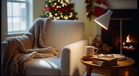 Cozy winter evening at home. Cozy living room with cozy armchair, cup of hot drink, bookshelves and christmas lights on background.