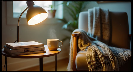 A serene living room scene featuring a comfortable armchair with a throw blanket, a wooden side table with books and a coffee cup, and a potted plant, all bathed in warm natural light.