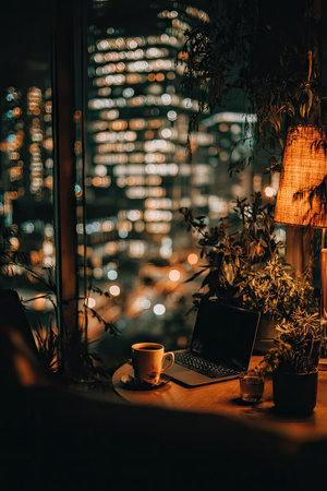 A laptop and coffee cup sit on a table, plants add a natural touch. The background features a blurry cityscape at night with a warm light. The image evokes a sense of relaxation and productivity, suitable for websites, editorial content, and various design projects.