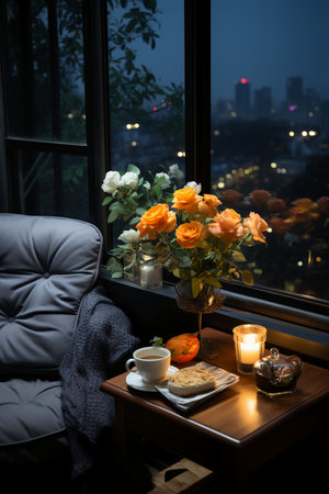 Cozy living room with coffee cup, books and candles on the table