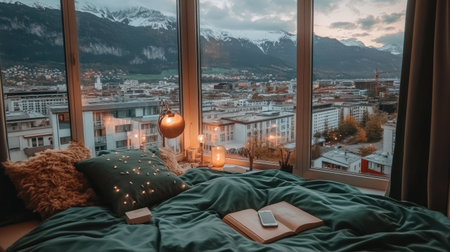 Bedroom with a large window showcasing a panoramic cityscape and snow-capped mountains. Soft lighting and cozy decor create a peaceful and relaxing ambiance.