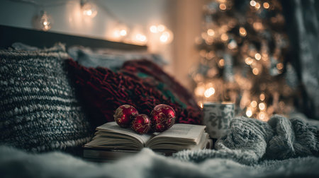 A warm reading nook features a book resting on soft blankets decorated with red ornaments and surrounded by fairy lights creating a festive mood.