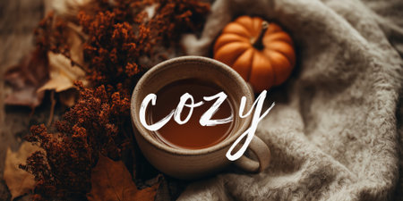 The text COZY on the background of an autumn drink in a cup on an autumn background with pumpkins, orange fallen leaves, autumn clothes, scarves.