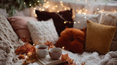 Cozy autumn afternoon with warm drinks and decorative pillows in a softly lit living room