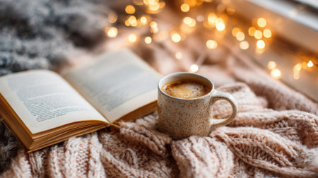 A warm and inviting scene featuring an open book beside a mug filled with coffee resting on a chunky knitted blanket. Soft fairy lights twinkle in the background creating a peaceful atmosphere.