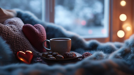 A cozy setup with Valentine chocolates, a cup of hot cocoa, and a plush blanket, photographed near a softly lit window.