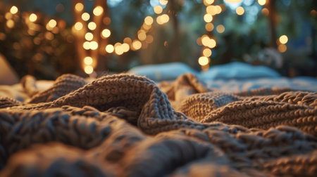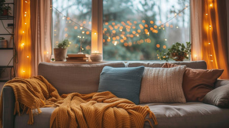 A cozy living room scene featuring a warm knit blanket draped over a couch, a steaming cup of coffee on a wooden table, and soft bokeh lights creating a tranquil atmosphere.