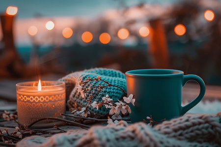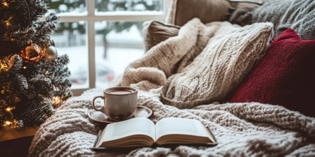 Cup of hot drink on knitted blanket. Soft lights and books by the window. Relaxed winter evening mood.