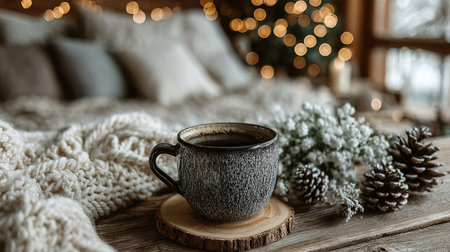 A cozy winter scene featuring a mug of coffee on a wooden table, surrounded by a knit blanket, pine cones, and soft holiday lights, evoking warmth and comfort.