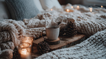 Cozy winter scene with a ceramic mug of hot coffee resting on an open book, a thick knit blanket, and a softly lit candle. Pinecone and evergreen sprig add rustic charm to the calm home setting Generated AI