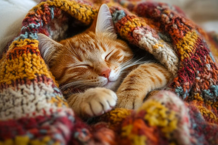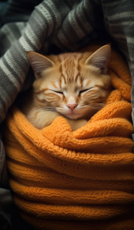 Cozy tabby cat sleeps peacefully, wrapped in warm blanket closeup image, ai generated. Sleepy kitty. Feline autumnal coziness close up photography. Comfort and relaxation concept photo realistic