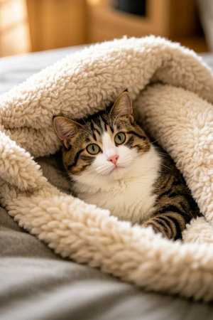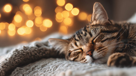 A serene image of a cat peacefully resting in a soft blanket, surrounded by a warm and inviting indoor atmosphere. The gentle glow adds to the cozy vibe.