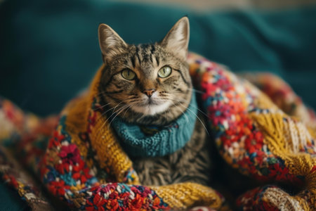Serene tabby cat sports a snug cowl, wrapped in a vibrant, multicolored blanket