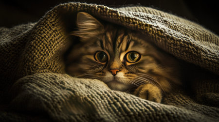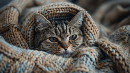 A delightful fluffy kitten nestled within a cozy knit blanket, radiating warmth and cuteness. This heartwarming scene captures pure comfort and innocence.