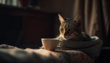 AI Generated. A cup of hot coffee, a blanket, cas well asles as well as a domestic cat looks to the side