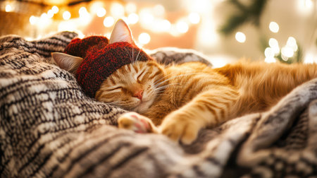 A cozy ginger cat in a knit hat relaxes on a blanket surrounded by twinkling holiday lights capturing the Christmas spirit.