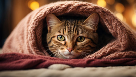 A wide-eyed tabby cat wrapped in a cozy knitted blanket with a bokeh light background.