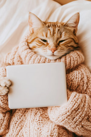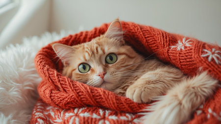 AI Generated. Cute Orange Cat with Big Eyes Snuggled in Cozy Red Knitted Sweater