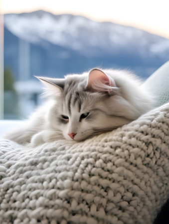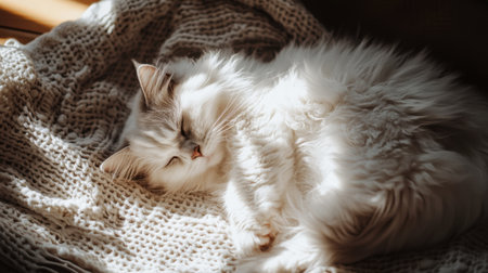 A serene and adorable white cat peacefully sleeping on a soft knit blanket, enjoying warm sunlight in a cozy home setting. Perfect for pet lovers.