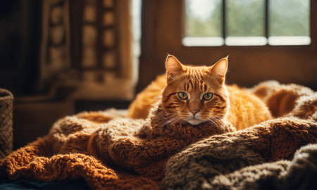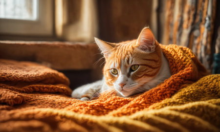 Charming portrait of a cat lying on a warm and cozy blanket, conveying its personality and attractiveness.