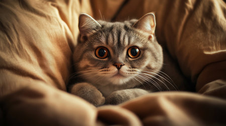 A charming gray cat with large, expressive eyes nestled in soft bedding, creating a warm and cozy atmosphere ideal for pet lovers and animal photography.