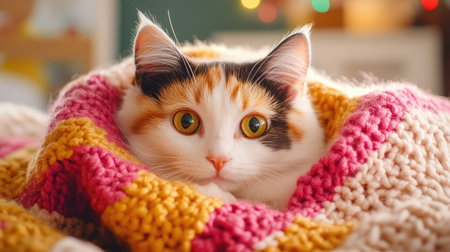 This delightful image captures an adorable calico cat nestled in a soft, colorful blanket, exuding warmth and tranquility, perfect for cat lovers.