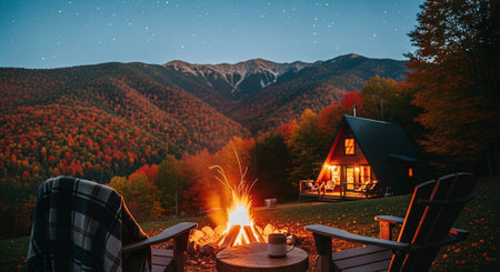 Warmly lit cabin room with a comfy sofa and blanket overlooking a forest with fall foliage