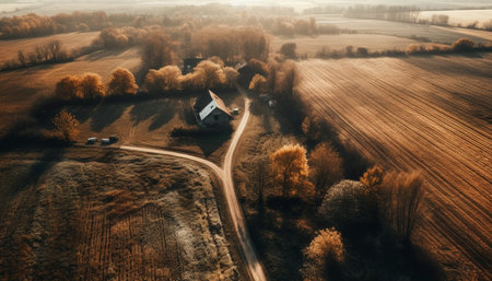 a gorgeous autumnal agricultural field captured in a low-altitude drone aerial photograph.