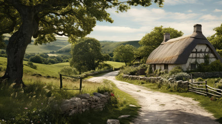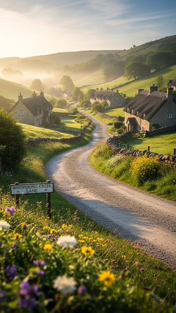 A winding dirt road meanders through a sun-drenched English countryside village. Stone walls and vibrant wildflowers line the path, with mist softening the rolling...