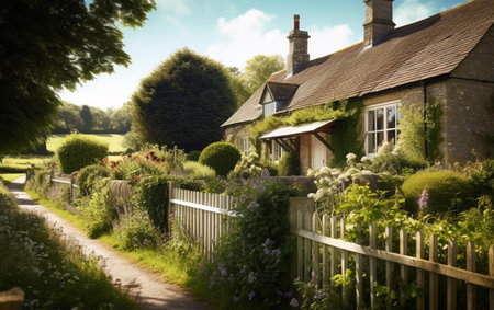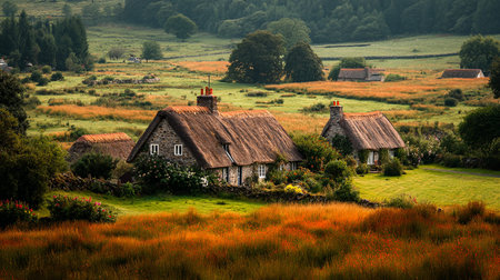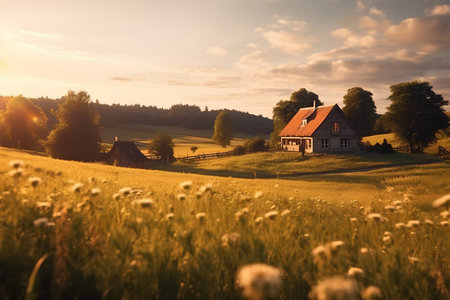 AI Generated. Cottage sunset valley landscape idyllic rural home
