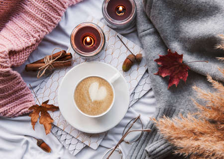 Cozy home interior with a cup of coffee, a book, candles, autumn leaves and a knitted plaid.