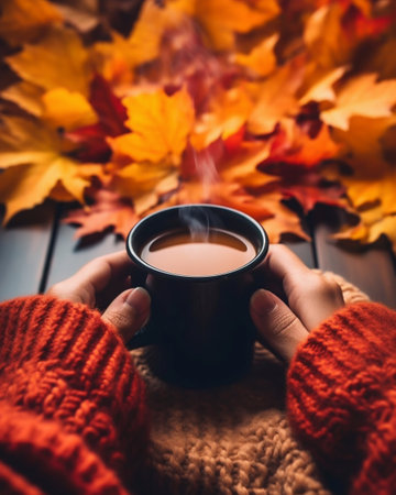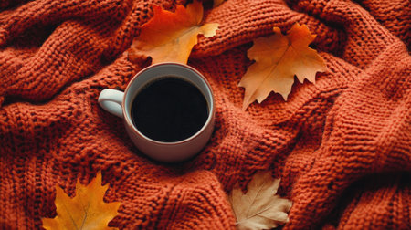 Embrace the autumn season with this warm and inviting image featuring a coffee mug surrounded by colorful leaves on a cozy knit blanket. This enchanting scene captures the essence of fall, perfect for evoking feelings of comfort and relaxation.