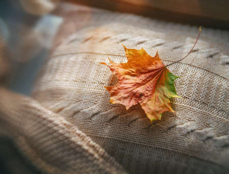 Cup of coffee and autumn leaves on a warm knitted plaid in the living room