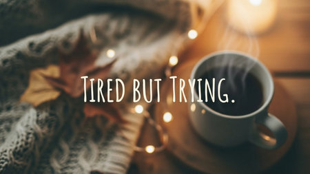 Cozy and warm photo with steaming mug and text 'Tired but Trying', comforting vibe