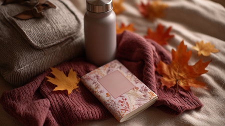 Cozy autumn setting with a journal, water bottle, and fallen leaves on a knitted blanket