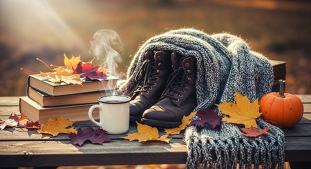 A cozy indoor scene featuring a wooden table with a steaming mug, warm knitted socks, stacked books, a small pumpkin, and a lit candle, with decorative gourds in the background