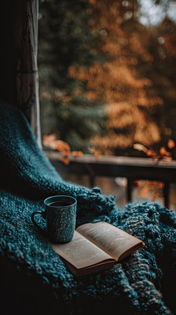 An open book and a coffee cup rest atop a knitted blue throw by a window. The scene is illuminated by soft light. Warm colors from the autumn foliage are visible outside. This image could be suitable for lifestyle blogs, book promotions, or cozy themes.