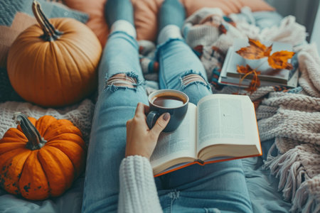 Imagine a beautifully serene autumn scene complete with a snug couch, soft warm blankets, and a colorful pumpkin, all creating the perfect cozy reading nook for relaxation this lovely fall season