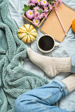 Female legs with beautiful chrysanthemum flowers, notebook and cup of tasty pumpkin coffee on bed
