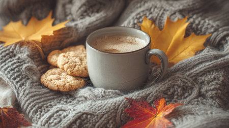 Cozy fall still life featuring a mug of hot coffee or cocoa and cookies on a warm gray cable-knit sweater. Surrounded by vibrant red and yellow maple leaves, perfect for autumnal and comfort themes.