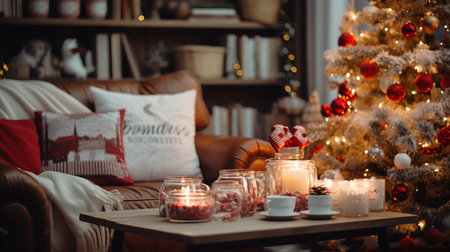 A cozy living room with a decorated christmas tree, wrapped gifts, a warm blanket on the sofa, and a cup of hot beverage with candy canes on a wooden table