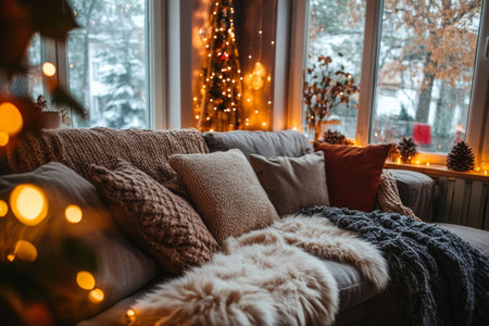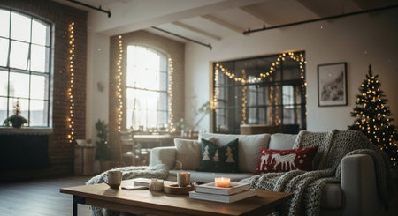 Cozy winter living room with soft textures and warm lights for a festive atmosphere