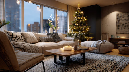 A beautifully decorated living room featuring a warm and inviting atmosphere, complete with a lit Christmas tree, soft cushions, and festive decorations for the holiday season.