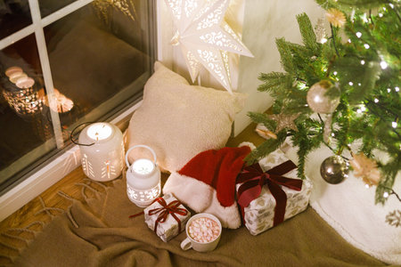 Winter hygge. Warm cup of cocoa with marshmallow under festive christmas tree with lights, gifts, soft cozy pillow and santa hat. Atmospheric christmas eve at home