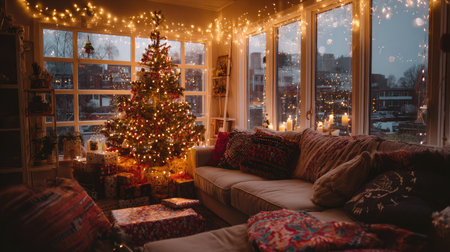 Festive living room scene with Christmas tree lights glowing, cozy blankets, and holiday decorations creating a joyful holiday ambiance.