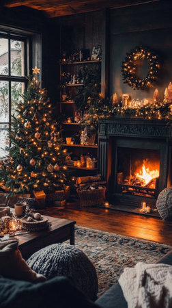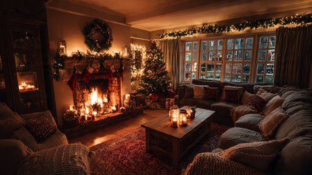 A cozy living room decorated for Christmas. A beautiful Christmas tree, a warm fireplace, and glowing candles create a festive and relaxing atmosphere.